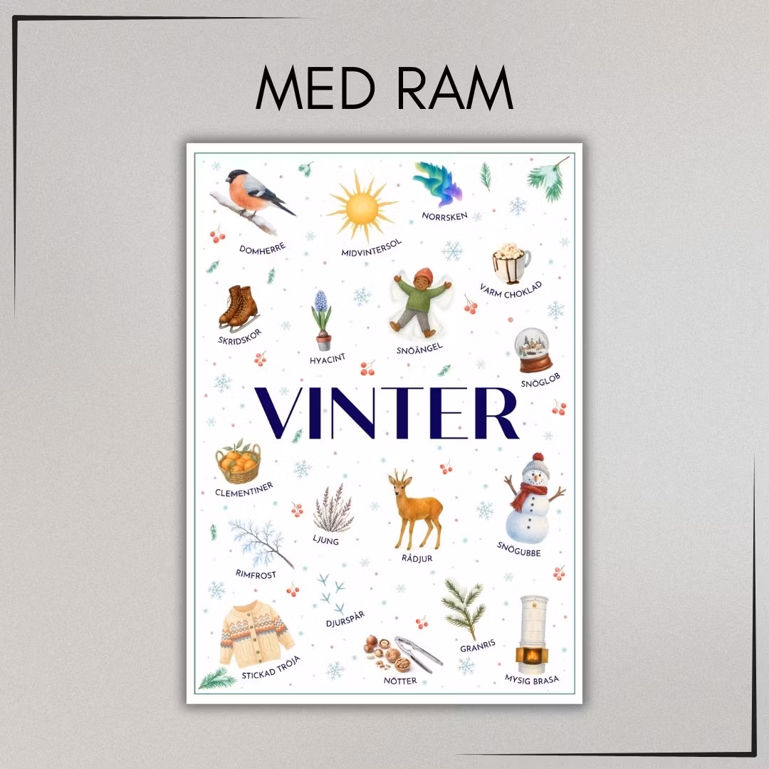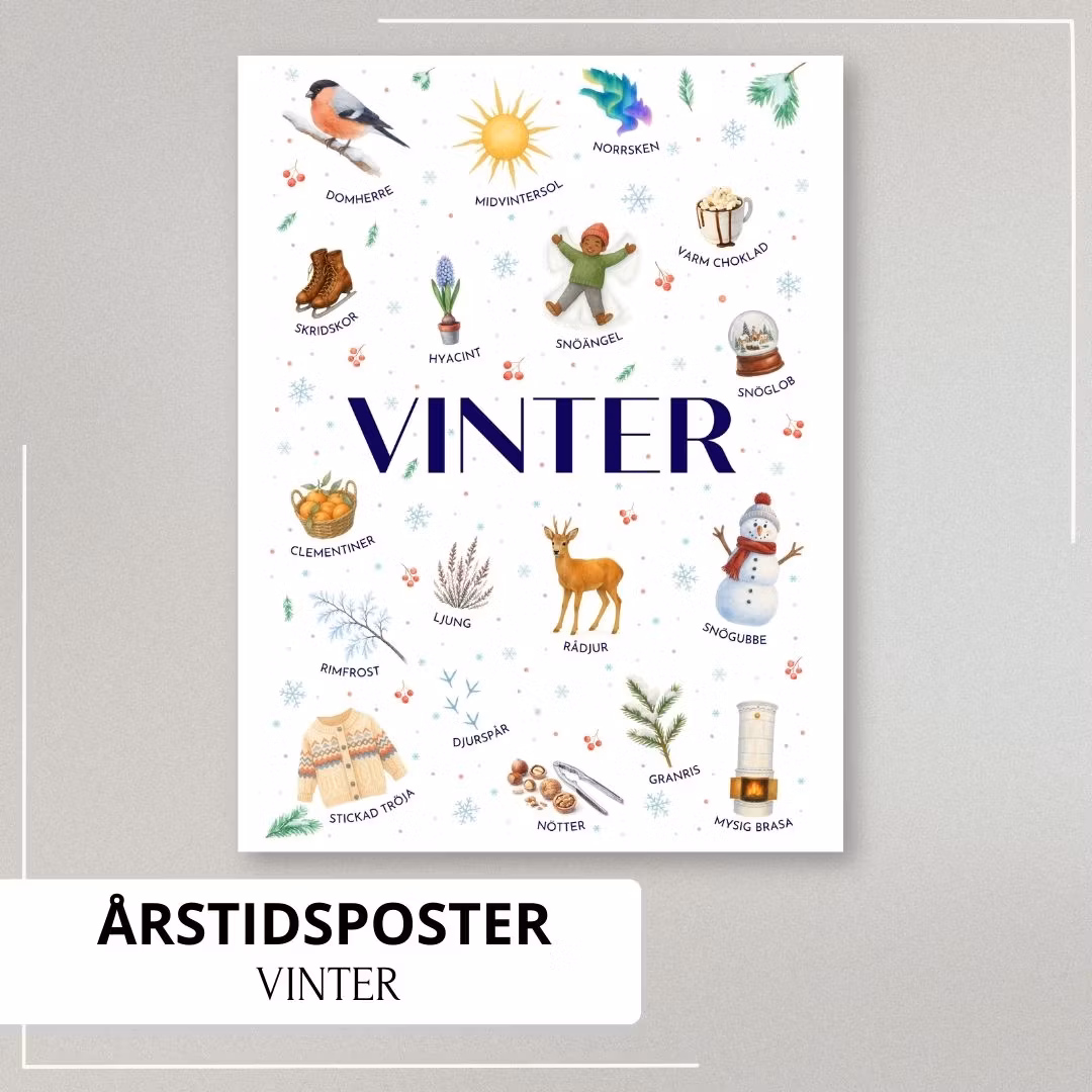 Upptäck vinterns färger, former och magi med en poster som visar vanliga vintertecken och sådant som hör årstiden till – från rimfrost och norrsken till djurspår i snön.
