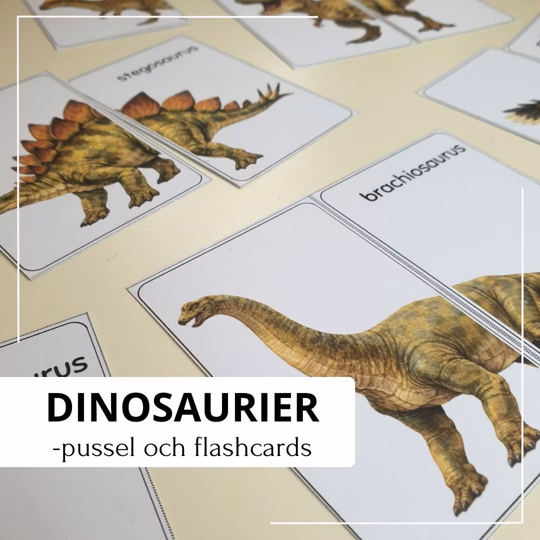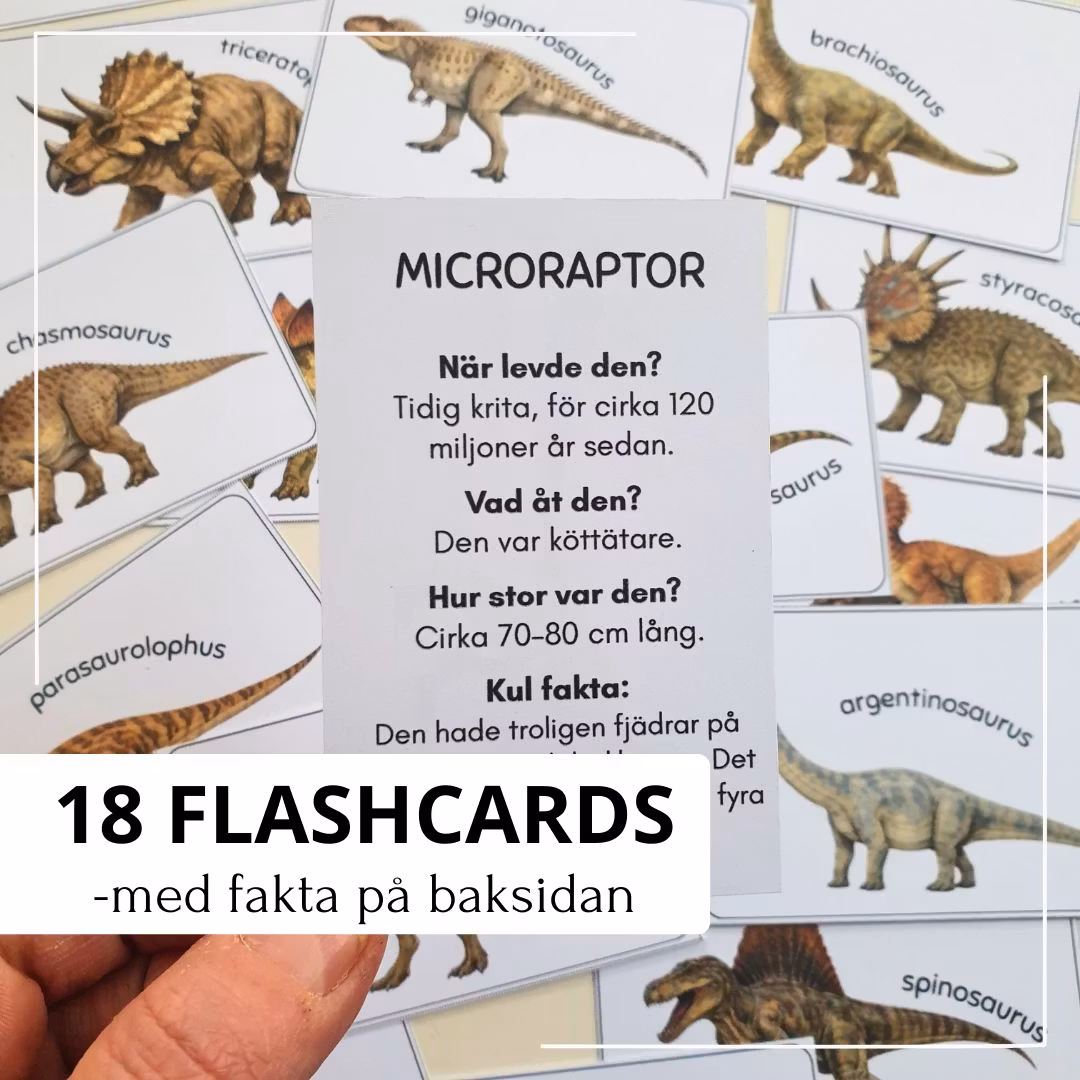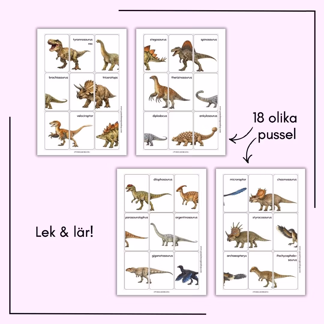 I häftet får du dinopussel att klippa ut och bygga ihop samt flashcards med bild, namn och kort fakta. Perfekt för lekfullt lärande hemma, i förskolan eller i klassrummet.