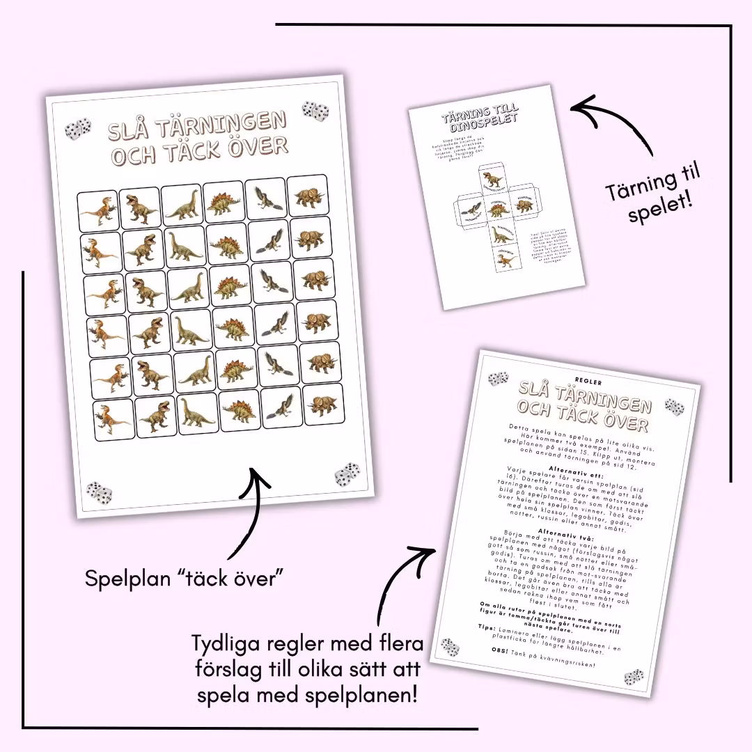 Här får du 11 olika aktiviteter med dinotema som bjuder in till både skapande, fantasi och rörelse. Barnen får skriva, rita, spela spel, vika loppa, göra egna dinosaurier av kartong och skapa fina dinomobiler. Ett varierat häfte som passar lika bra hemma som i förskolan eller klassrummet.